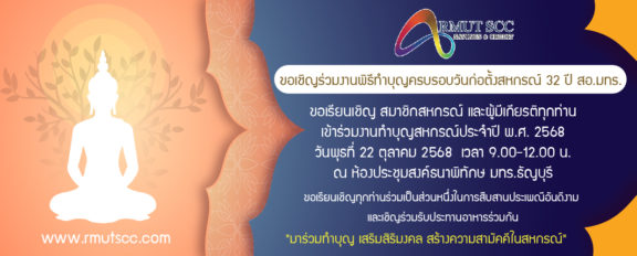 ขอเชิญร่วมงานพิธีทำบุญครบรอบวันก่อตั้งสหกรณ์ 32 ปี สอ.มทร.
