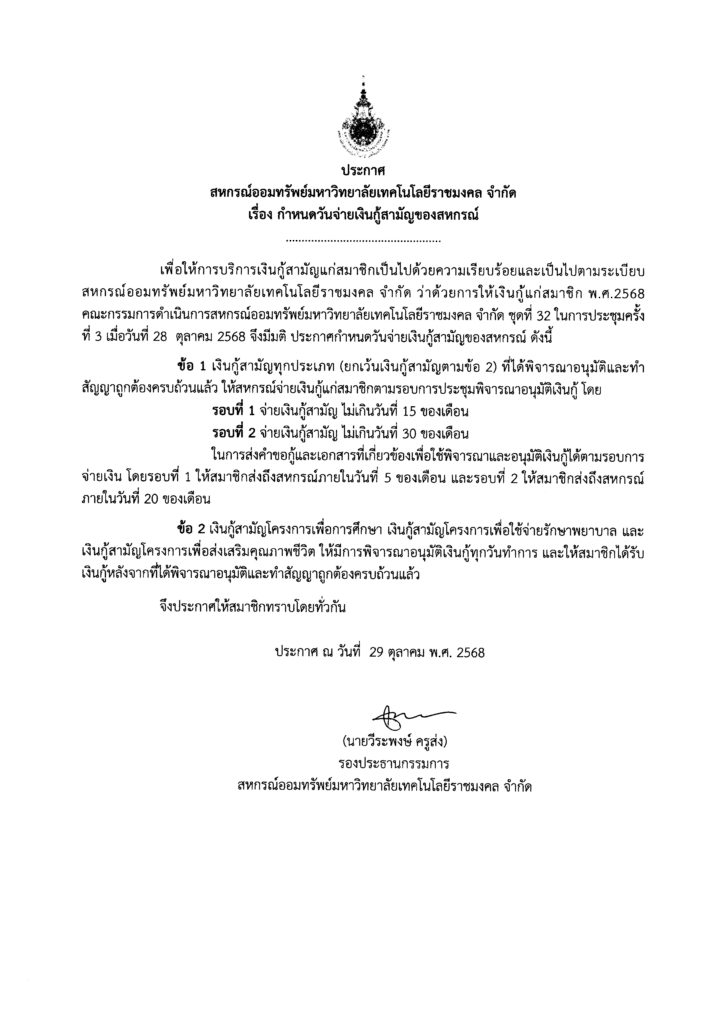 กำหนดวันจ่ายเงินกู้สามัญของสหกรณ์