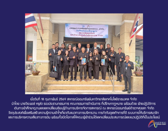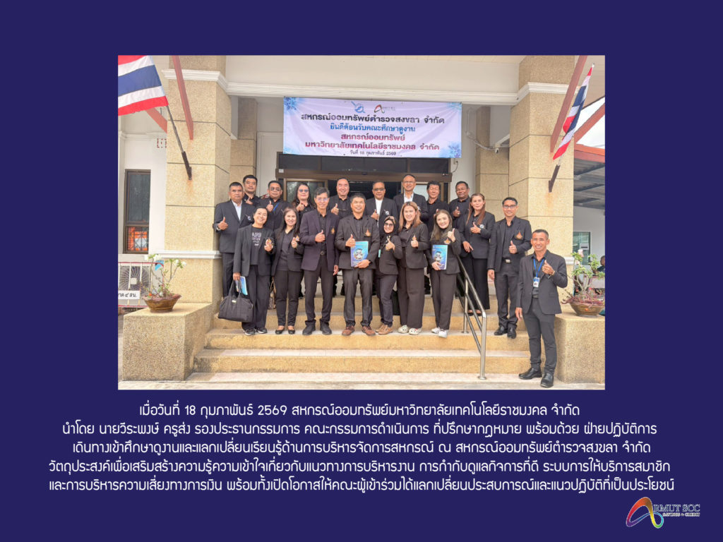เมื่อวันที่ 19 กุมภาพันธ์ 2569 สหกรณ์ออมทรัพย์มหาวิทยาลัยเทคโนโลยีราชมงคล จำกัด ได้จัด “โครงการสหกรณ์สัญจรพบผู้บริหารและสมาชิก” นำโดย นายวีระพงษ์ ครูส่ง รองประธานคณะกรรมการดำเนินการสหกรณ์ออมทรัพย์มหาวิทยาลัยเทคโนโลยีราชมงคล จำกัด ณ ห้องประชุมชลาทัศน์ มหาวิทยาลัยเทคโนโลยีราชมงคลศรีวิชัย วิทยาเขตสงขลา โดยมี ผู้ช่วยศาสตราจารย์ปิยะ ประสงค์จันทร์ รองอธิการบดี มหาวิทยาลัยเทคโนโลยีราชมงคลศรีวิชัย ให้เกียรติเป็นประธานในการประชุม ให้การต้อนรับ และมีสมาชิกสนใจเข้าร่วมกิจกรรมเป็นจำนวนมาก