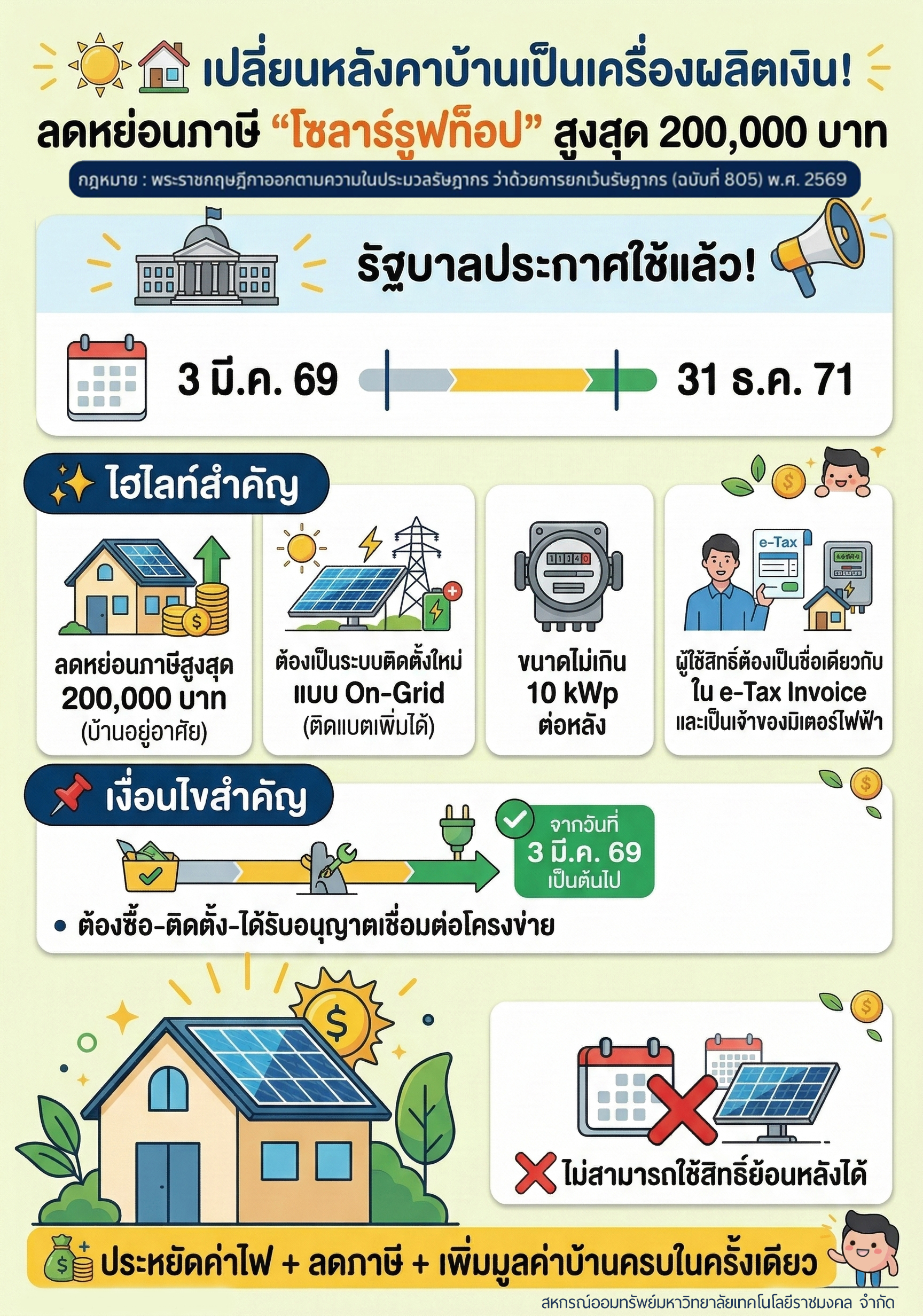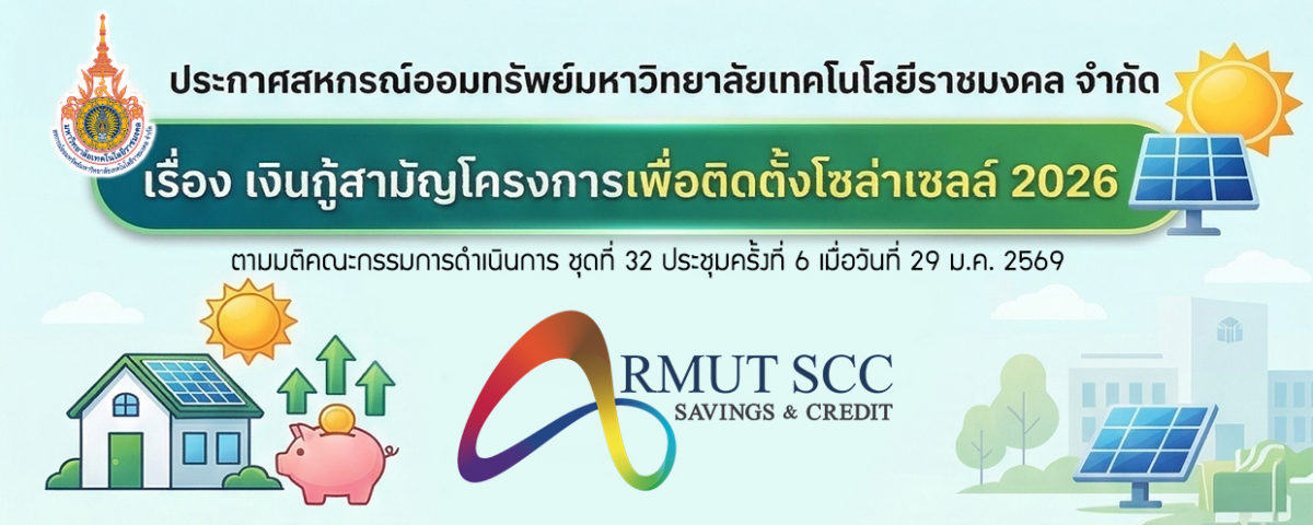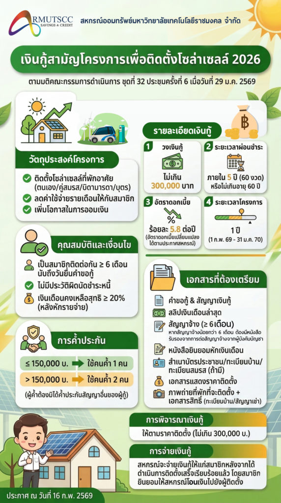 ประกาศ สหกรณ์ออมทรัพย์มหาวิทยาลัยเทคโนโลยีราชมงคล จำกัด เรื่อง เงินกู้สามัญโครงการเพื่อติดตั้งโซล่าเซลล์ 2026
